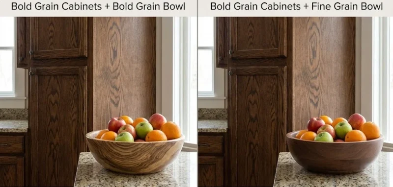 If your kitchen cabinets have a very busy, bold grain, choose a fruit bowl with a fine, smooth grain. This creates a visual “rest” for the eye and allows the bowl’s shape to be the star of the show.