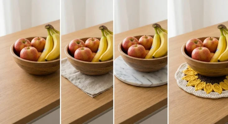 Place a linen napkin, a marble trivet, or even a crochet coaster (like your sunflower accents!) underneath the bowl. This “breaks” the line of sight between the two woods, making the subtle difference in grain look like a deliberate design choice rather than an accidental mismatch.